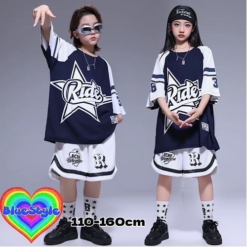 【243】キッズダンス衣装 セットアップ 2点セット 女の子用 男の子用 男女兼用 派手 ストリート系 ヒップホップ ダンスウェア 半袖 練習着