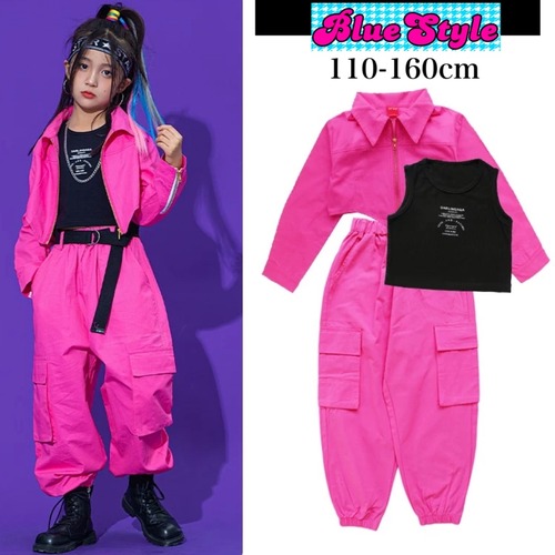 キッズダンス衣装 3点セット 女の子用 カジュアル 蛍光色 シンプル ストリート系 ピンク ヒップホップ ダンスウェア 練習着