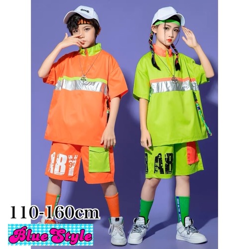 キッズダンス衣装 セットアップ 男女兼用 派手 ストリート系 オレンジ ヒップホップ ダンスウェア 練習着 グリーン