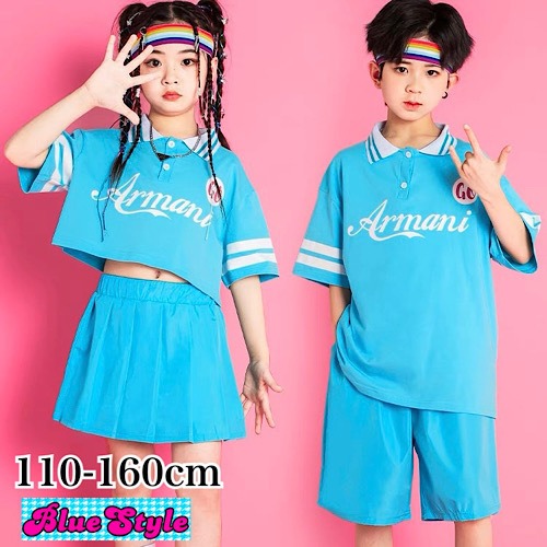 キッズダンス衣装 セットアップ 男の子用 女の子用 派手 ストリート系 ブルー ヒップホップ ダンスウェア 練習着 水色