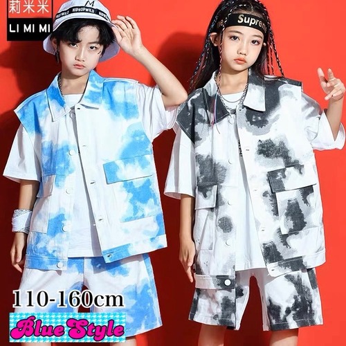 キッズダンス衣装 セットアップ 男女兼用 派手 ストリート系 ブラック ブルー ヒップホップ ダンスウェア 練習着