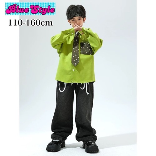 キッズダンス衣装 セットアップ 男の子用 女の子用 ユニセックス 男女兼用 シンプル ストリート系 グリーン ヒップホップ ダンスウェア 練習着